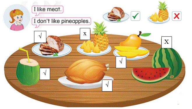 (Đánh dấu (√) vào những cái bạn thích và dấu (X) vào những cái bạn không thích. Nói.)