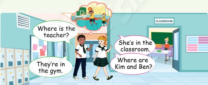 b. Where are teacher Sam and Anna? (Thầy Sam và cô Anna đang ở đâu?)