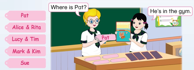Cách chơi: Làm các thẻ, một bên là thẻ có tên người (ví dụ: Pat, Alice & Rita, Lucy& Tim, Mark & Kim, Sue..), một bên là thẻ về nơi chốn. Một bạn sẽ lật thẻ có tên bất kì, một bạn cầm thẻ về nơi chốn và trả lời.
