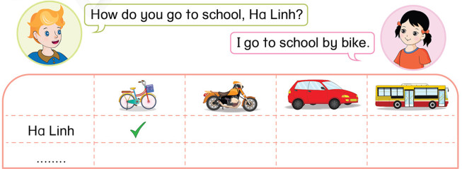 – How do you go to school, Vinh? (Bạn đi đến trường bằng gì, Vinh?)