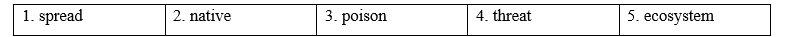 Cane toads were introduced into Australia in 1935. They were used to help control insects. These insects were causing problems for farmers for years. The toads have now (1) _____ to many other parts of the country. Some of Australia’s (2) _____ animals hunt the cane toads. However, cane toads’ bodies contain a (3) _____. It can hurt or even kill other animals. Cane toads have become a (4) _____ to Australia’s (5) _____.