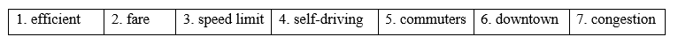 a. Unscramble the words.b. Fill in the blanks with the words from Task a.a. Listen to Alan talking to several people about future transportation in cities. Where are they talking? b. Now, listen and answer.