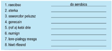 a. Unscramble the words, then fill in the blanks with go, do, play or hang out.