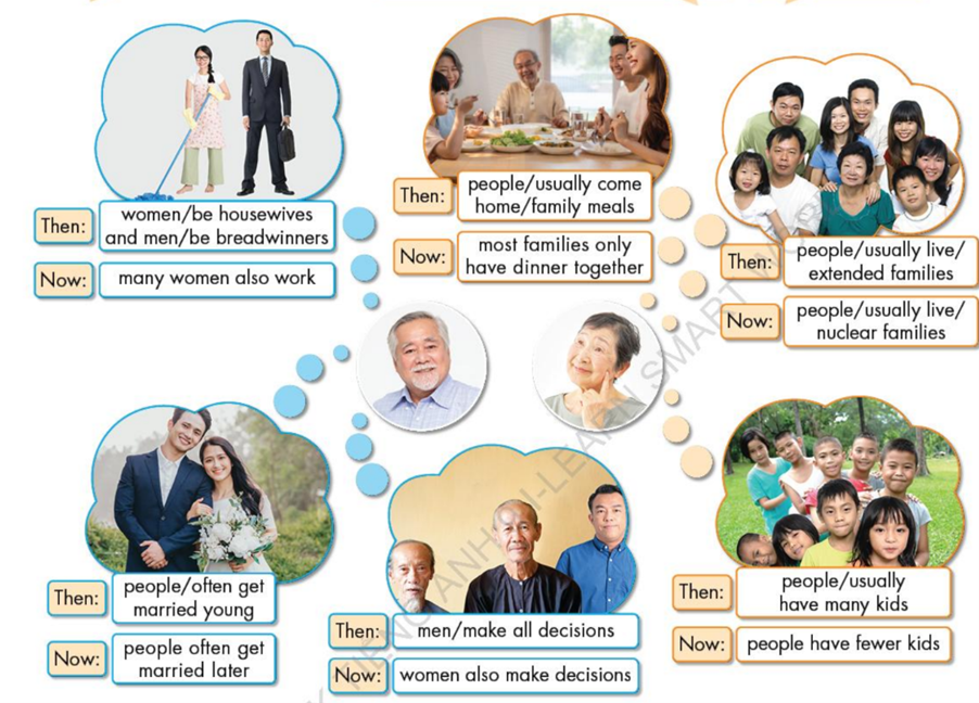 (Thảo luận theo cặp: Thảo luận về cách mà mọi người nhớ về truyền thống và phong tục gia đình trong quá khứ và so sánh chúng với hiện tại. Thảo luận về các điểm sau.)
