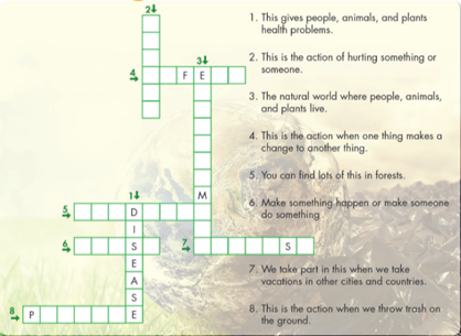 a. Unscramble the words. b. Do the crossword puzzle. a. Read the essay. Which effect of pollution is NOT mentioned?b. Now, read and answer the questions. Underline the mistakes and write the correct words on the lines. Complete the questions and write your own answers in full sentences.
