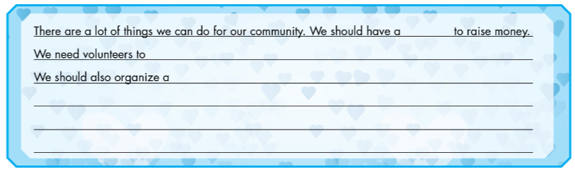 Có rất nhiều điều chúng tôi có thể làm cho cộng đồng của mình. Tôi nghĩ chúng ta nên có một cuộc chạy đua vui vẻ để gây quỹ. Chúng ta có thể nhờ thầy cô giúp đỡ. Chúng ta có thể tham gia cuộc chạy từ trường học của mình đến bất kỳ nơi nào trong thị trấn. Chúng ta có thể dùng tiền để giúp đỡ trẻ em nghèo trong nước. Chúng ta có thể mua sách cho trường học của họ. Chúng ta cũng có thể thu thập quần áo cho họ. Chúng ta cũng có thể giúp đỡ những động vật vô gia cư. Chó và mèo ở trại động vật thường không nhận được sự chăm sóc cần thiết. Chúng thường xuyên bị ốm và cần thuốc. Chúng ta có thể yêu cầu bạn bè của mình đưa tiền cho họ. Các tình nguyện viên có thể giúp chăm sóc và chơi đùa với những con vật này. Chúng ta cũng có thể giúp đưa thức ăn cho động vật và tắm cho chúng.