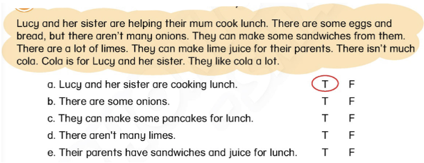 Lucy và chị gái cô ấy đang giúp mẹ của họ nấu bữa trưa. Có vài quả trứng và bánh mì, nhưng không có nhiều hành. Họ có thể làm một vài cái bánh mì sandwich từ chúmg. Có rất nhiều chanh. Họ có thể làm nước ép chanh cho bố mẹ của họ. Không có nhiều cola. Cola là cho Lucy và chị gái cô ấy. Họ thích cola rất nhiều.