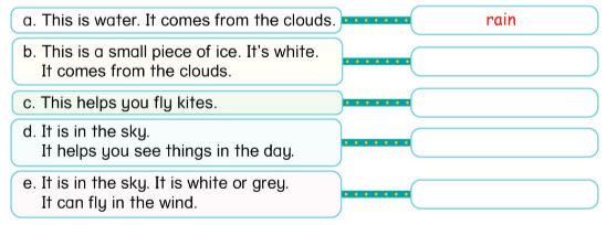 b. This is a small piece of ice. It’s white. It comes from the clouds. (Đây là 1 mảnh nhỏ của đá. Nó màu trắng. Nó đến từ mây.)