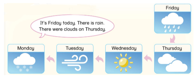 Hôm nay là thứ 6. Trời có mưa. Trời nhiều mây vào thứ 5. Trời có nắng vào thứ 4. Trời nhiều gió vào thứ 3. Trời có tuyết vào thứ 2.