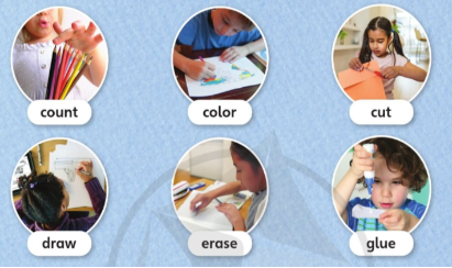 C: He can cut the paper. She can draw the flowers. I can color the picture.