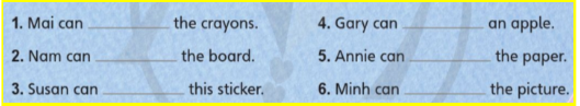 (Anh ấy có thể cắt giấy. Cô ấy có thể vẽ hoa. Tôi có thể tô màu bức tranh.)