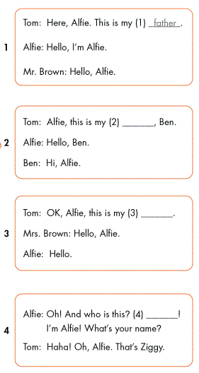 Tom: Here, Alfie. This is my (1) father. (Đây Alfie, đây là bố tớ.)