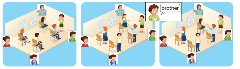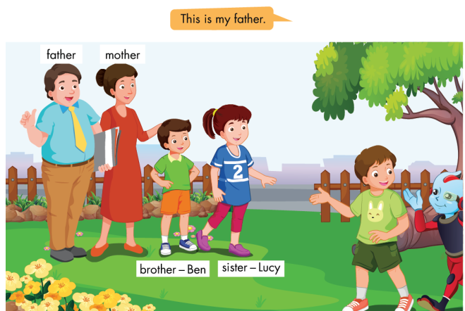 A. 1. Listen and point. Repeat. 2. Play Four corners. B. 1. Listen and practice. 2. Fill in the blanks. Practice C. 1. Listen and repeat. 2. Chant D. 1. Look and listen. 2. Listen and write. 3. Practice with your friends. E. 1. Point, ask and answer. 2. Role-play. F. 1. Draw your family. Point and say. 2.Role-play.