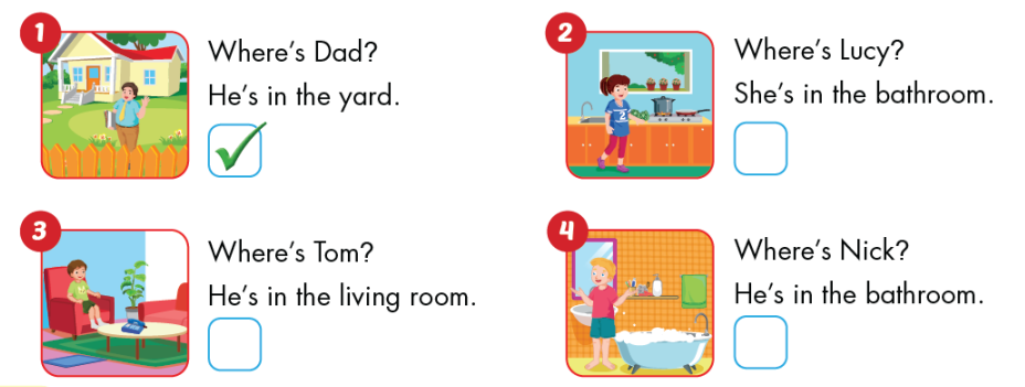 Ben: He’s in the (4) yard. (Cậu ấy ở ngoài sân.)