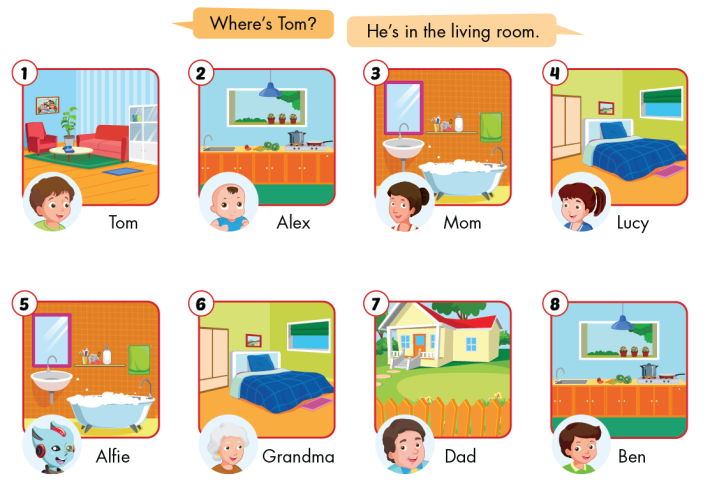 Tom: He’s in the (3) bathroom. (Anh ấy ở trong nhà tắm.)