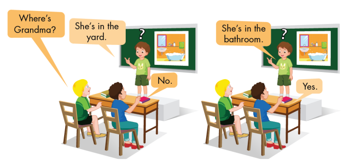 Ví dụ: Các bạn dưới lớp sẽ đặt câu hỏi gợi ý là:“Where’s Grandma?”, bạn chơi không được quay lại nhìn bảng và đoán “She’s in the yard.” hoặc “She’s in the bathroom.”…