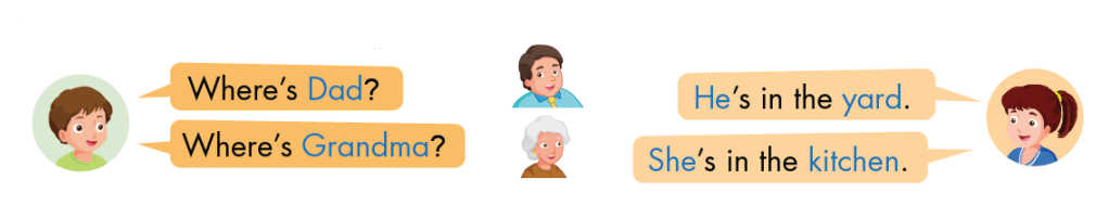 Mom: He’s in the kitchen. (Ông ấy ở trong nhà bếp.)