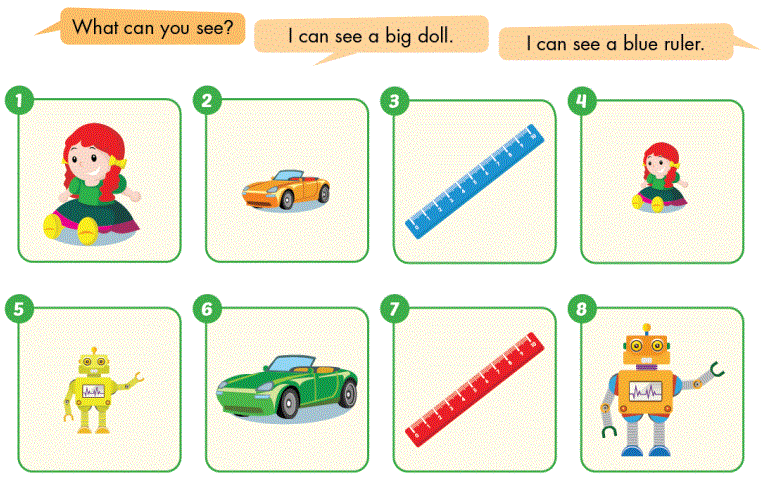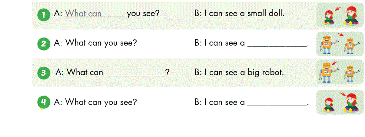 1. A: What can you see? (Bạn có thể nhìn thấy cái gì?)