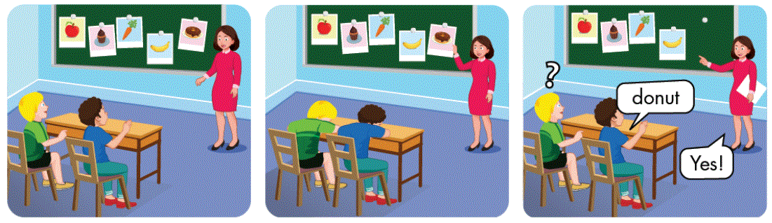 Cách chơi: Cô sẽ dán thẻ là hình về đồ ăn (ví dụ: apple, cupcake, carrot, banana, donut …) lên bảng, các bạn nhìn qua một lượt và ghi nhớ đồ ăn có trên bảng. Cô sẽ lấy đi bất kì một thẻ nào, các bạn dưới lớp úp mặt xuống bàn và không được nhìn lên bảng. Khi cô đã hoàn thành và hỏi thẻ hình nào bị thiếu thì các bạn mới ngẩng đầu lên, nhìn lên bảng và trả lời nhanh.