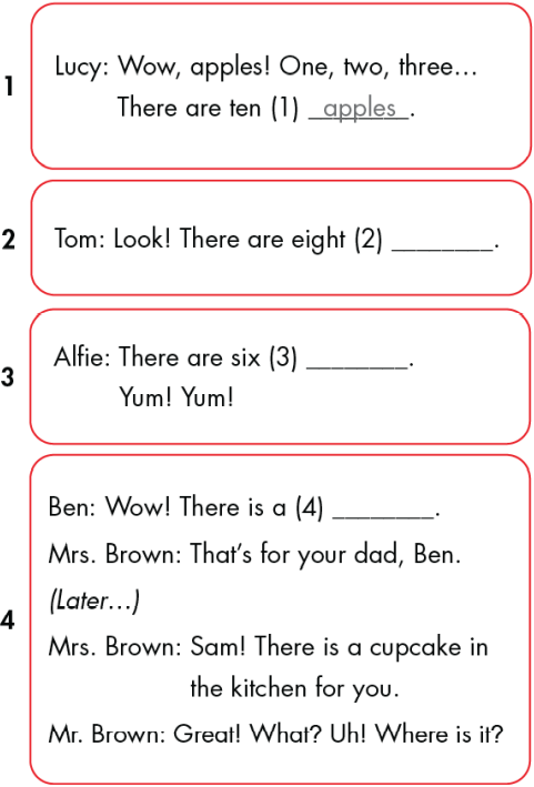 1. Lucy: Wow, apples! One, two, three… There are ten (1) apples(Uầy, táo! Một, hai, ba… Có mười quả táo.)