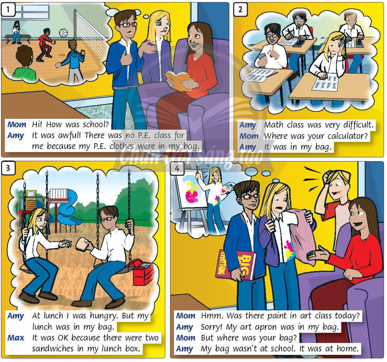 Amy: Nó không có ở trường ạ. Cặp sách vẫn ở nhà.