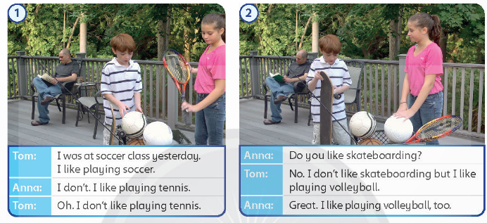 Tom: No. I don’t like skateboarding but I like playing volleyball. (Không. Tôi không thích trượt ván nhưng tôi thích chơi bóng chuyền.)