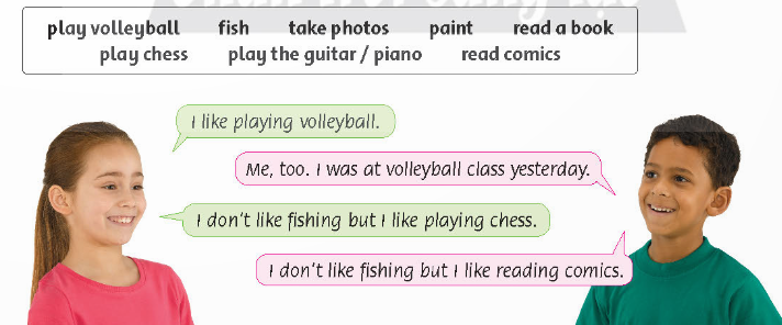 (Mình cũng thích câu cá lắm. Cậu có thích chơi các trò chơi không? Mình thì có đấy. Mình thích chơi cờ.)