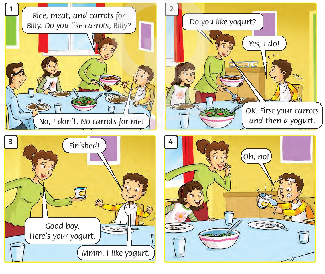 1. Rice, meat, and carrots for Billy. Do you like carrots, Billy?