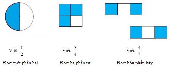 Mỗi phân số có tử số và mẫu số. Tử số là số tự nhiên viết trên gạch ngang. Mẫu số là số tự nhiên khác 0 viết dưới gạch ngang.