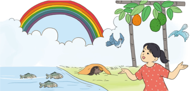 Em thích hình ảnh “Mọi mái nhà riêng / Có mái nhà chung / Rực rỡ vòm cao / Bảy sắc cầu vồng”. Vì hình ảnh này thể hiện sự tươi đẹp của bầu trời mang lại, của mái nhà chung của mọi người là trái đất.