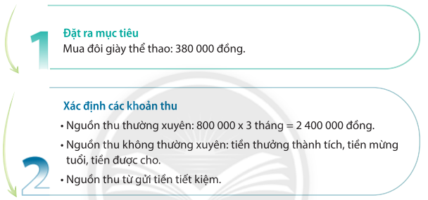Bố mẹ cho M. mỗi tháng là 600 000 đồng để ăn sáng; 200 000 đồng tiền tiêu vặt. Bên cạnh đó, M. có thể tự kiếm thêm cho mình 200 000 đồng mỗi tháng nhờ vào một số công việc như bán phế liệu, viết bài gửi báo, làm các sản phẩm thủ công,.. Ngoài ra, ông bà còn thường khi M. đạt được thành tích trong học tập và rèn luyện. M, đã lập kế hoạch tài chính trong 3 tháng tới như sau: