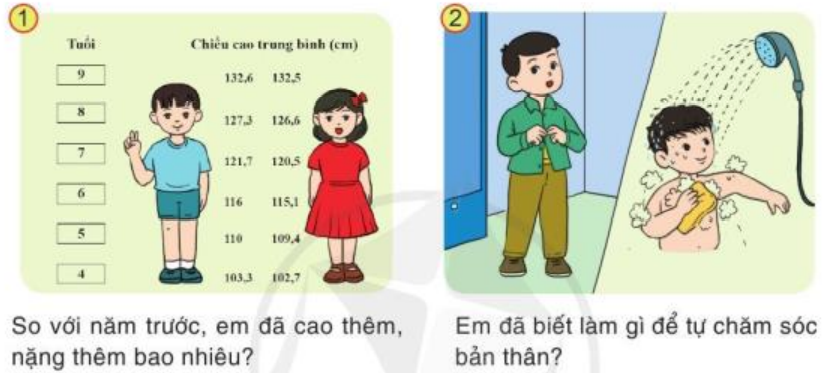 Em tự liên hệ bản thân và lần lượt trả lời các câu hỏi trong tranh để hoàn thành bài tập.