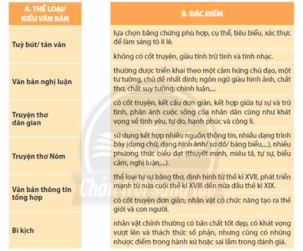 Kẻ vào vở hai cột A, B theo mẫu dưới đây, sau đó nối tên thể loại ở cột A với đặc điểm phù hợp được nêu rõ ở cột B; giải thích lí do bạn tạo ra các đường nối giữa hai cột A và B
