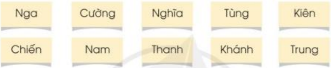 Chiến, Cường, Khánh, Kiên, Nam, Nga, Nghĩa, Thanh, Trung, Tùng.