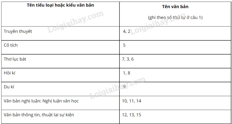 Ghi tên văn bản đọc hiểu ở SGK ngữ văn 6, tập một đã nêu trong câu 1 vào các ô ở cột bên phải sao cho phù hợp với tên tiểu loại hoặc kiểu văn bản ở cột bên trái trong bảng sau: