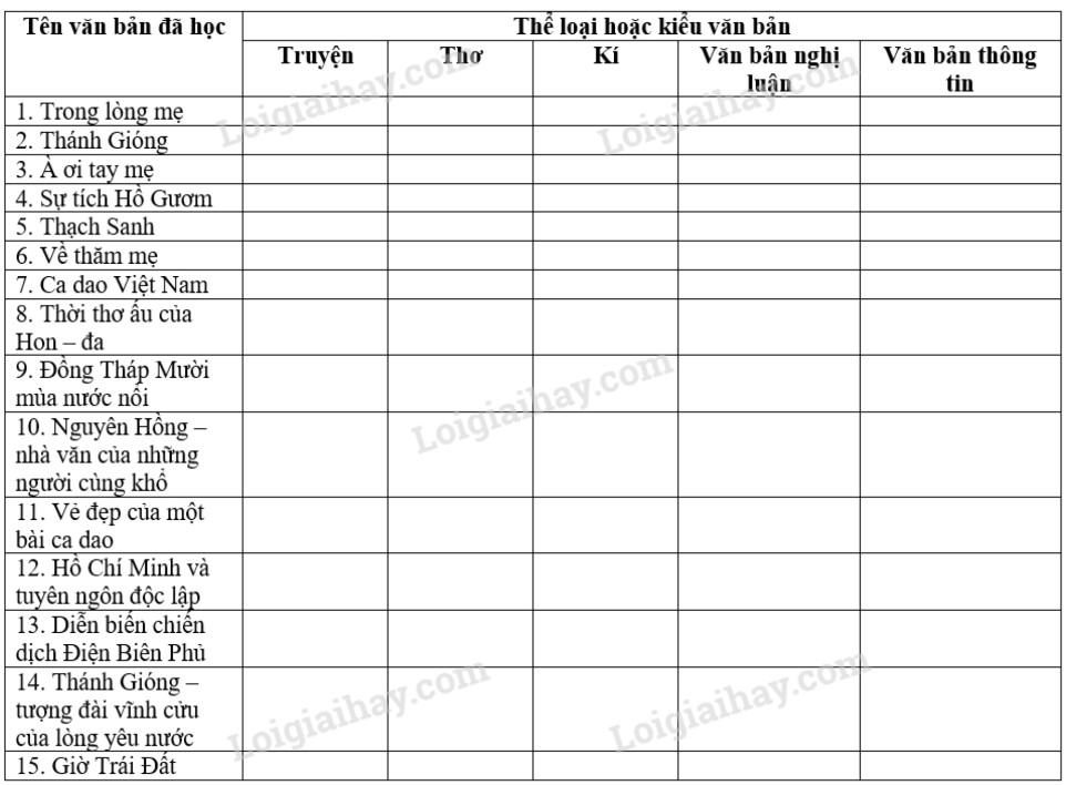 Đánh dấu x vào ô trống ở cột thể loại hoặc kiểu văn bản trong bảng sau cho phù hợp với các văn bản đọc hiểu ở SGK Ngữ văn 6, tập một:
