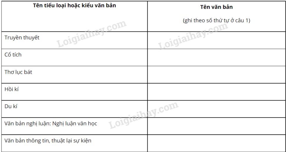Ghi tên văn bản đọc hiểu ở SGK ngữ văn 6, tập một đã nêu trong câu 1 vào các ô ở cột bên phải sao cho phù hợp với tên tiểu loại hoặc kiểu văn bản ở cột bên trái trong bảng sau: