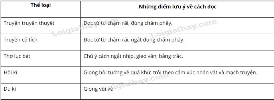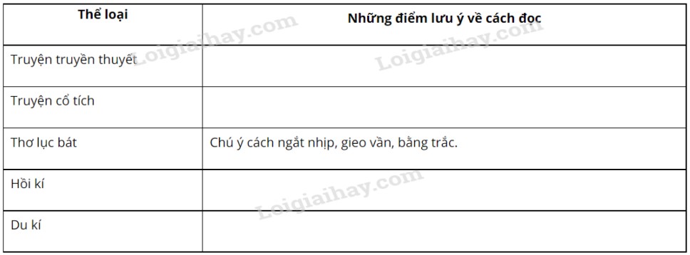Thống kê vào bảng sau những điểm cần chú ý về cách đọc truyện (truyền thuyết, cổ tích), thơ (lục bát) và kí (hồi kí, du kí):