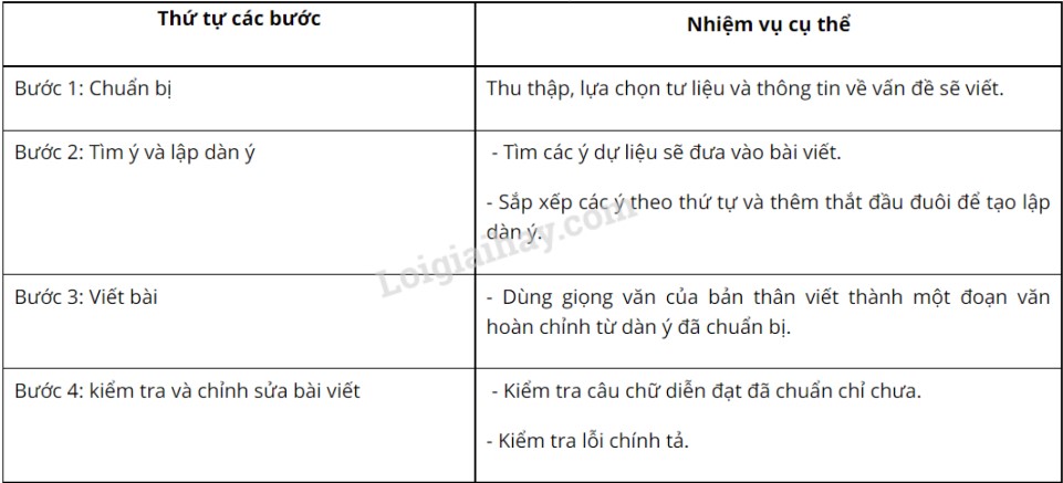 (Câu hỏi 6, SGK) Nêu các bước tiến hành viết một văn bản; chỉ ra nhiệm vụ của mỗi bước.