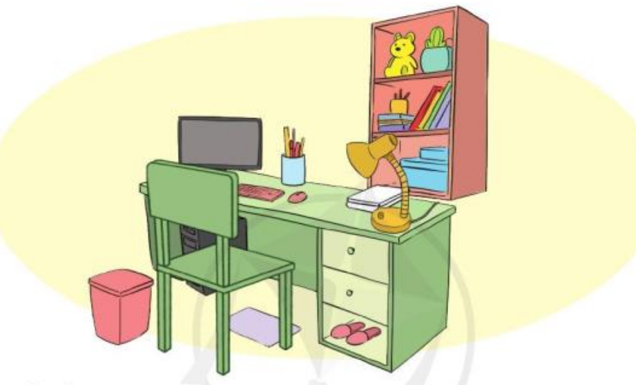 Những đồ vật có trong hình là: Bàn học, hế, tủ sách, máy tính, bút, thước, đèn, gấu bông, sách vở, dép, thùng rác…
