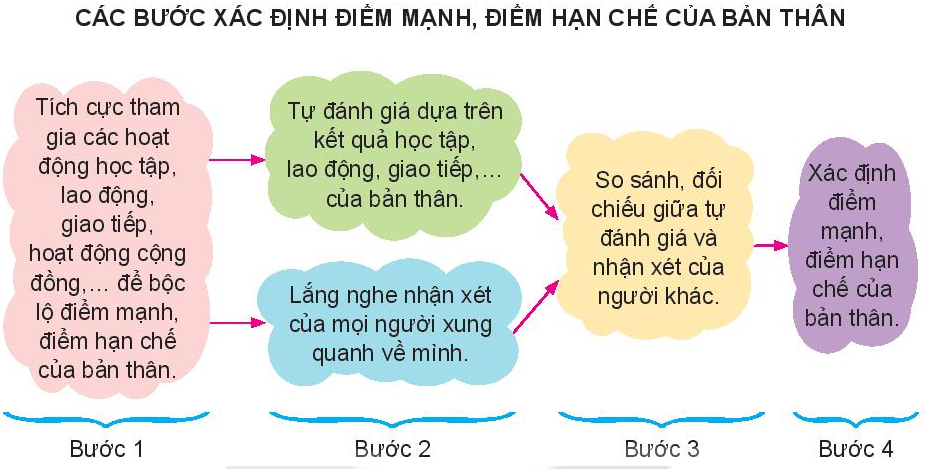 – Bước 1: Tích cực tham gia các hoạt động học tập, lao động, giao tiếp, hoạt động cộng đồng,….. để bộc lộ điểm mạnh, điểm hạn chế của bản thân.