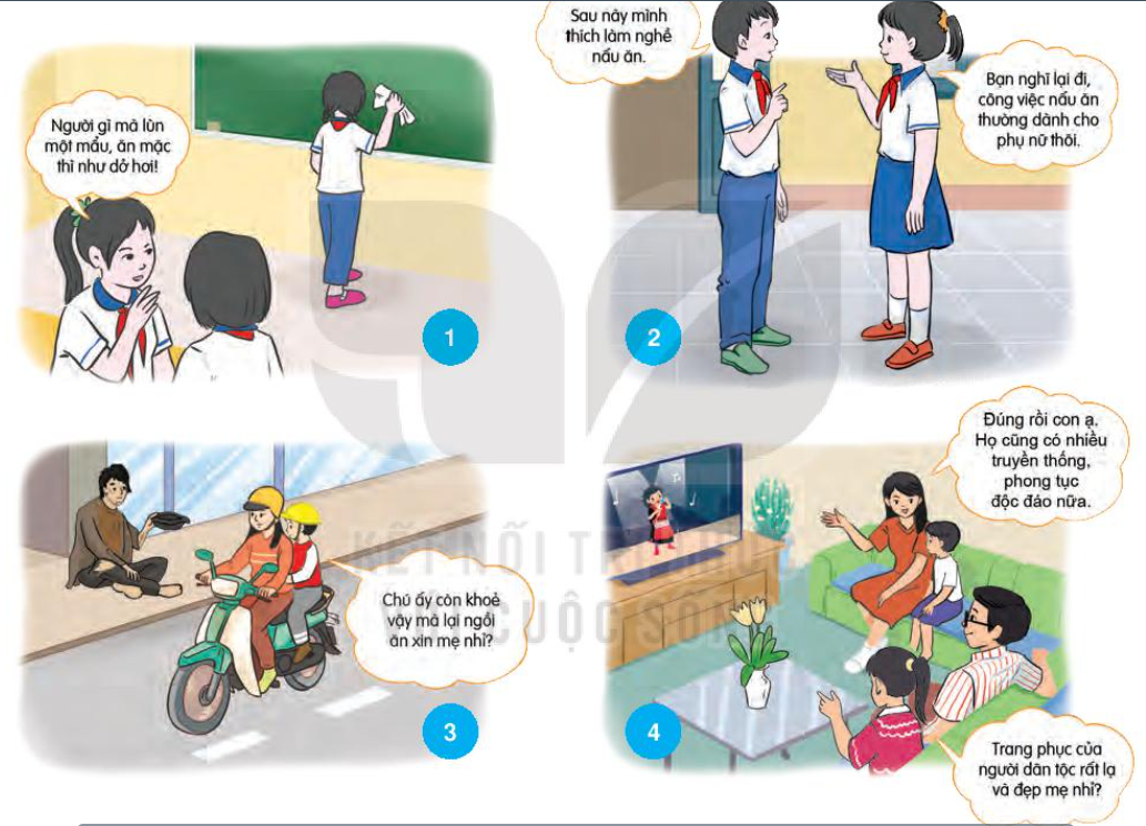 + Tranh 2: vì bạn nữ có quan điểm sai lầm về nghề nghiệp, còn mang nặng tư tưởng phân biệt giới tính, không tôn trọng ước mơ của bạn.