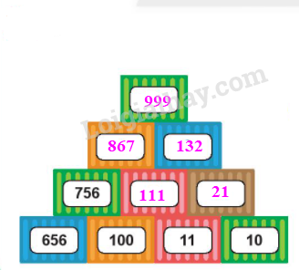 Quan sát tranh em nhận thấy quy luật: Tổng của hai số hàng dưới bằng số hàng trên. Từ đó em điền được các số còn thiếu vào chỗ trống.