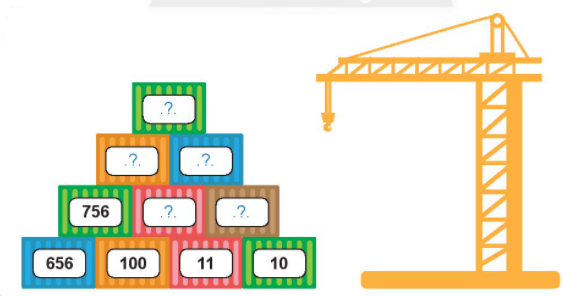 Quan sát tranh em nhận thấy quy luật: Tổng của hai số hàng dưới bằng số hàng trên. Từ đó em điền được các số còn thiếu vào chỗ trống.