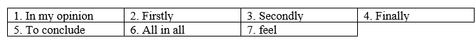 (5) To conclude / Secondly, tests can be helpful in many different ways. (6) All in all / Firstly, I (7) feel / am feeling that they are one of the most important parts of school life.
