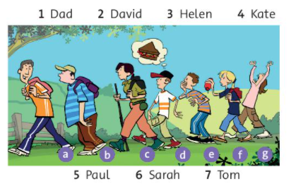 This is a nice picture of some of our family and friends on a walk. You can see my dad. He’s very fit, and he loves sport. He’s in sports clothes. There’s my aunt, Helen. She’s my dad’s older sister. She’s very active. And she loves walking. Near aunt Helen, there’s also my dad’s friend Paul. He’s in sports clothes too. But he’s really unfit. He’s very lazy. And he never does much exercise. You can also see my sister, Sarah. It’s a hot day and she’s very thirsty. Then there’s my brother Tom. He’s always hungry. And not far from Tom. There’s my brother David. He’s ill in this photo. He isn’t very well at all. And there’s Sarah’s friend Kate. She’s very tired. I think Kate goes to bed late sometimes. And that’s all the people in the photo.