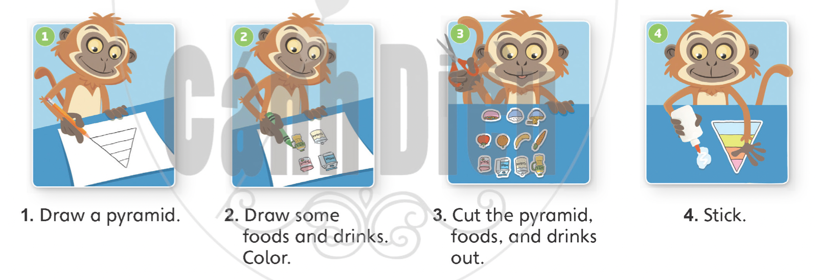 Find the words and say. Ask and answer. Make a food pyramid. Talk about your pyramid.