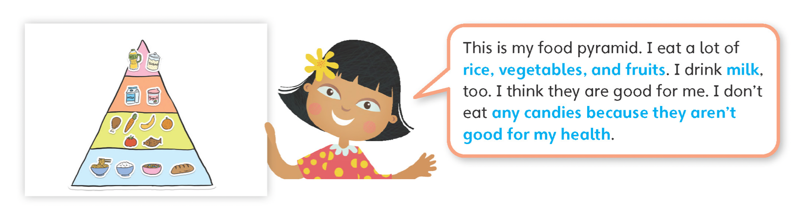 This is my food pyramid. I eat a lot of rice, vegetables, and fruits. I drink milk. too. I think they are good for me. I don’t eat any candies because they aren’t good for my health.
