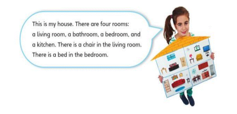 (Đây là ngôi nhà của tôi. Có 4 phòng: 1 phòng khách, 1 phòng tắm, 1 phòng ngủ, và 1 phòng bếp. Có 1 cái ghế ở trong phòng khách. Có 1 cái giường ở trong phòng ngủ.)