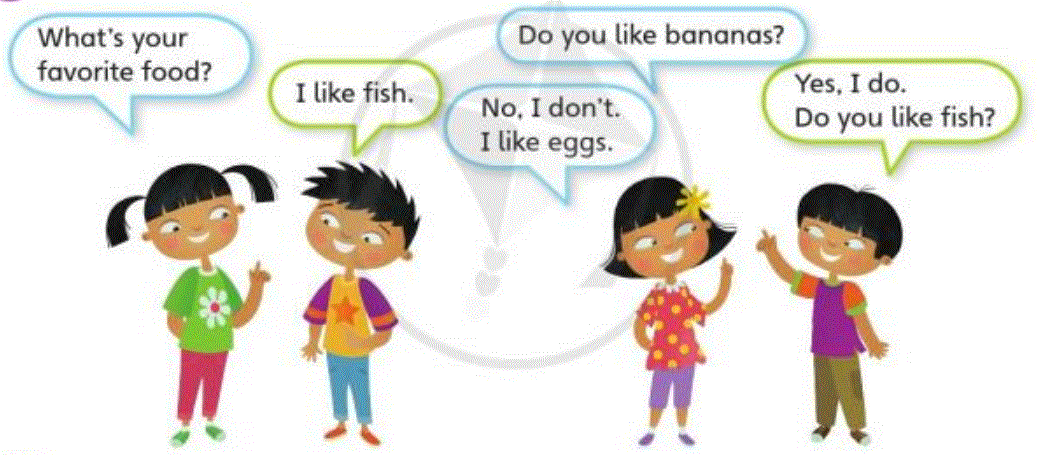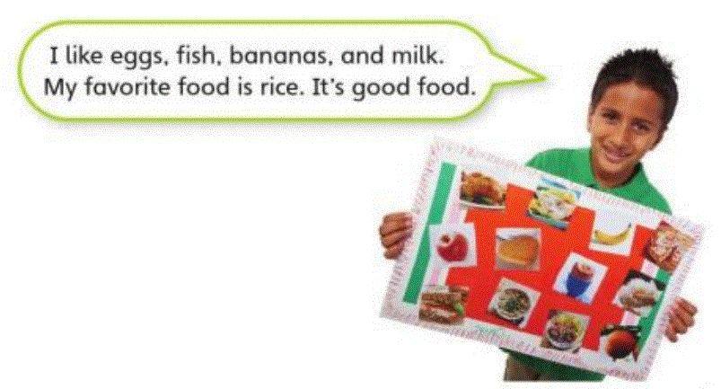 I like eggs, fish, bananas, and milk. My favorite food is rice. It’s good food.